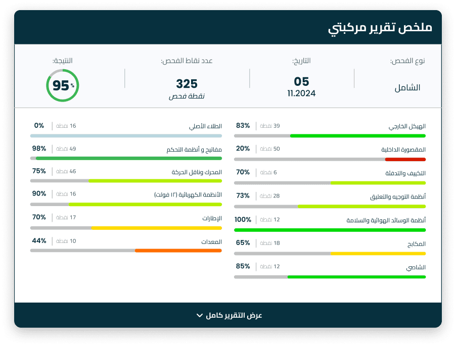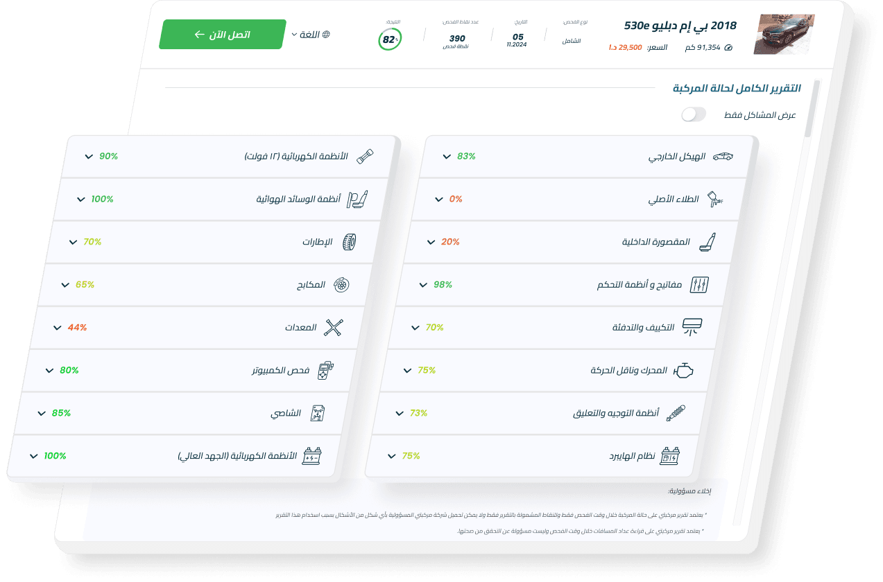 تقرير يغطي كل تفاصيل السيارة لضمان عدم تفويت أي جزء أونقطة، بدءًا من الأجزاء القابلة للاستهلاك وأنظمة الدفع المكلفة إلى هيكل السيارة و غيره المزيد