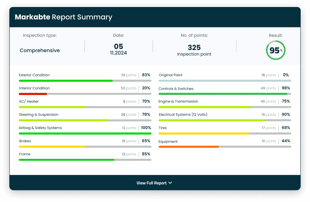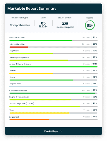 Markabte delivers detailed car inspection reports using advanced, on-site inspection technology. Our mobile technician teams visit the car at your location to collect and document inspection data using proprietary software and hardware tools. The data is then professionally analyzed remotely by trained technicians, ensuring all findings are thoroughly reviewed, supported by evidence, and generating transparent, reliable reports you can trust.